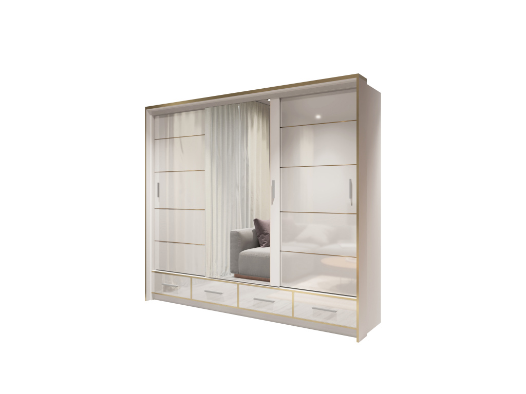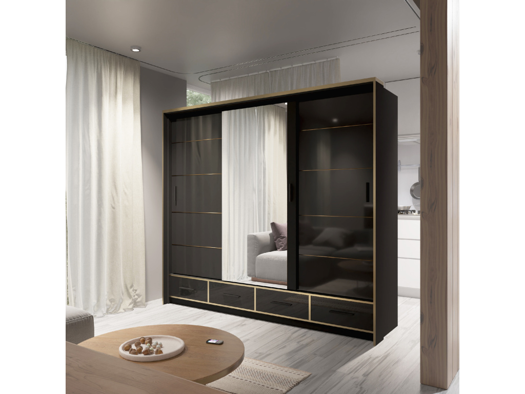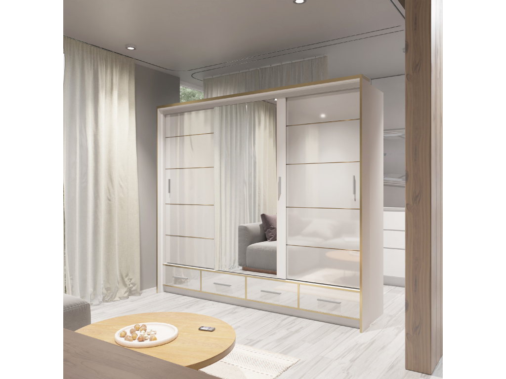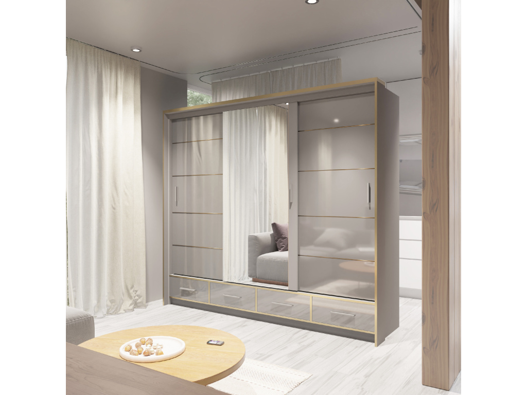 Skříň SEVILLA v luxusním lesklém provedení bílá, černá nebo šedá je stylovým a praktickým doplňkem moderního interiéru, zrcadlo opticky zvětšuje prostor a LED osvětlení v ceně dodává skříni elegantní vzhled i vyšší komfort při používání, díky šířce 250 cm nabízí dostatek úložného prostoru a stává se výrazným designovým prvkem každé ložnice.