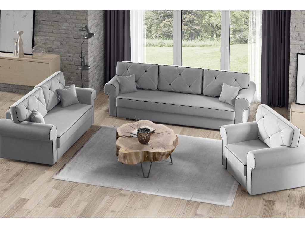 Sedací sestava Chester 3+2+1 je luxusní a pohodlná sestava s elegantním designem, která promění každý obývací pokoj ve stylové a útulné místo pro odpočinek i setkání s rodinou a přáteli, hlavní rozkládací pohovka nabízí prostornou plochu na spaní 194 x 140 cm s bonnelovými pružinami a kvalitní pěnou T2528 pro maximální pohodlí při sezení i spánku, doplňková otevřená pohovka a křeslo Chester poskytují variabilní uspořádání prostoru a dostatek míst pro všechny členy domácnosti, všechny sedáky a opěradla jsou vyplněné bonnelovými pružinami s pěnou a polštáře mají praktické zipy pro snadnou údržbu a dlouhodobou svěžest, elegantní čalounění a čalouněná zadní část pohovky zaručují nadčasový vzhled z každého úhlu, robustní rám z dřevotřísky, MDF a borovicového dřeva spolu s pevnými dřevěnými nohami poskytuje stabilitu a dlouhou životnost, praktický úložný prostor na ložní prádlo umožňuje udržet prostor čistý a přehledný, sestava Chester 3+2+1 kombinuje styl, pohodlí a praktičnost, stane se středobodem vašeho obývacího pokoje a nabízí komfortní místo pro každodenní relaxaci, sledování televize i pohodlné přespání hostů, ideální volba pro moderní domácnosti, které hledají kvalitní a elegantní sedací sestavu.