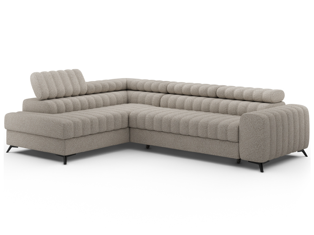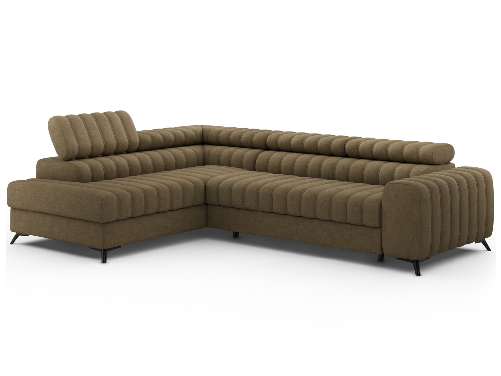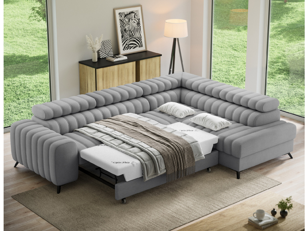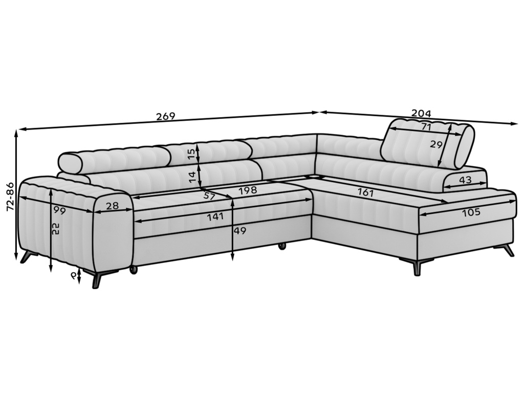 Rohová sedací souprava Kanedo je designový a vysoce funkční čalouněný kus, který kombinuje moderní estetiku s výjimečným komfortem, takže je ideální volbou pro prostorný obývací pokoj nebo relaxační zónu. Tento model s celkovými rozměry 269 × 204 × 86 cm a hmotností 146,2 kg vyniká pevnou konstrukcí a pečlivě profilovanými prvky, které poskytují ergonomickou oporu těla a vynikající relaxaci. Sedák je vybaven vlnovcovými pružinami typu B a kombinací pěny T3030 a profilované vysoce pružné pěny HR3030, které zajišťují optimální pružnost, odolnost a dlouhotrvající komfort sezení i při intenzivním používání. Opěradlo vyplněné polyuretanovou pěnou T2130 nabízí stabilní oporu a zvyšuje každodenní pohodlí. Rohová sedací souprava Kanedo má praktickou funkci spaní s plochou 194 × 124 cm, zatímco mechanismus Dolphin umožňuje rychlé a snadné rozložení. Další výhodou je prostorný úložný prostor na lůžkoviny o rozměrech 180 × 92 × 17 cm, který poskytuje pohodlné uložení textilií a činí z rohové sedací soupravy Kanedo vynikající volbu pro ty, kteří hledají moderní rohovou sedací soupravu s funkcí spaní, úložným prostorem a odolnou a kvalitní výplní.