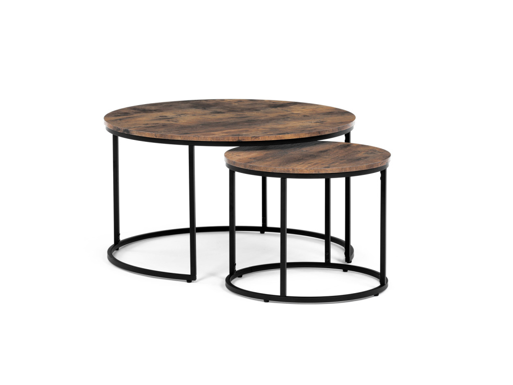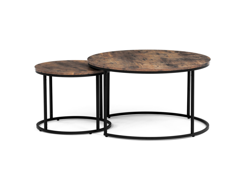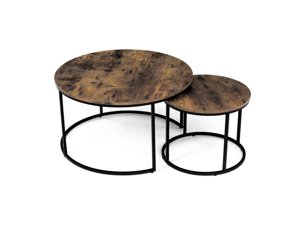 Set 2 ks konferenčních, ale i přístavných nebo odkládacích stolů přinese do vašeho domova nejen praktičnost, variabilitu, ale také industriální šarm. Stolky můžete rozmístit jednotlivě po interiéru, kde Vám vytvoří zajímavé odkládací prvky v různých výškových hladinách. A nebo společně povytažené, kde vytvoříte velkou odkládací plochu ve tvaru čísla 8. Velkou výhodou je možnost zasunutí stolků do sebe, což oceníte při úklidu, skladování nebo při potřebě většího prostoru. A jistě zaujmou nejen již uvedenou praktičností, ale také svým stroze čistým a nadčasovým designem. Kulaté desky z MDF v dekoru staré dřevo harmonicky doplňuje kovová konstrukce po jejich obvodu v černém matném práškovém nástřiku. Ta tvoří rovněž nohy a celkově stolky zpevňuje. Na spodní liště jsou umístěny černé plastové kluzáky, které zabraňují poškození povrchu podlahy při přesunech stolků. Deska o tloušťce 1,5 cm má průměr velmi příjemných 80 cm, menší 50 cm, výška stolů je 46 a 41 cm4. Konstrukce je čtvercového průřezu. Nosnost jednotlivého stolku je do 30 kg.Doplňkové parametry