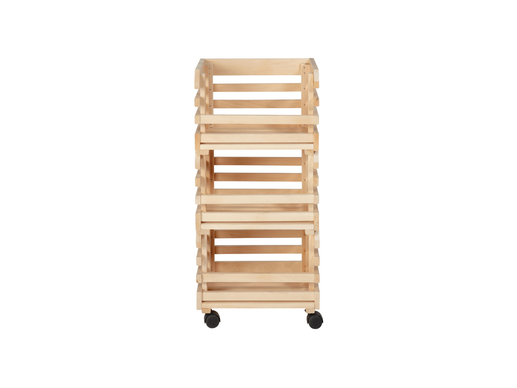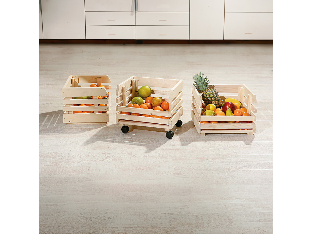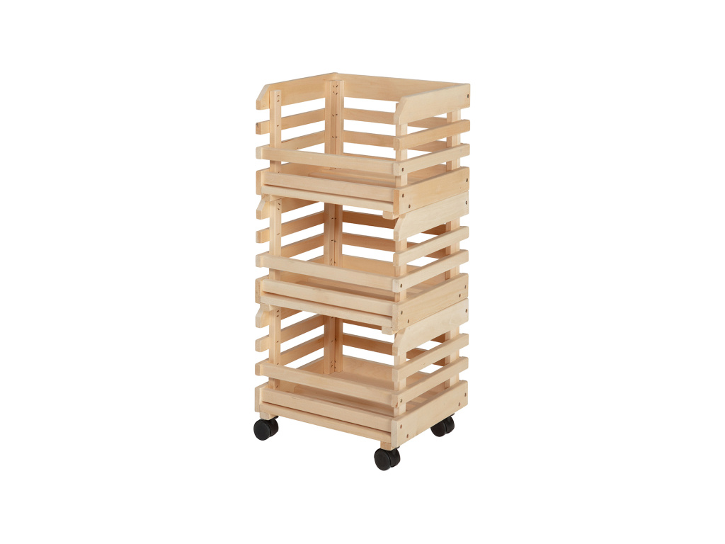 Skládací regál FRUITS je praktický a stylový doplněk do každé domácnosti, kuchyně nebo spižírny. Vyrobený z masivního dřeva v přírodním, nelakovaném provedení působí přirozeně a rustikálně. Regál tvoří tři stohovatelné bedýnky ideální pro uskladnění ovoce, zeleniny nebo dalších potravin. Spodní bedýnka je opatřena kolečky pro snadnou manipulaci, díky čemuž můžete celý regál pohodlně přesouvat podle potřeby. Skládací konstrukce umožňuje snadné uskladnění nebo převoz. FRUITS je nejen praktický, ale i elegantní pomocník pro přehledné a vzdušné uspořádání vašich potravin.