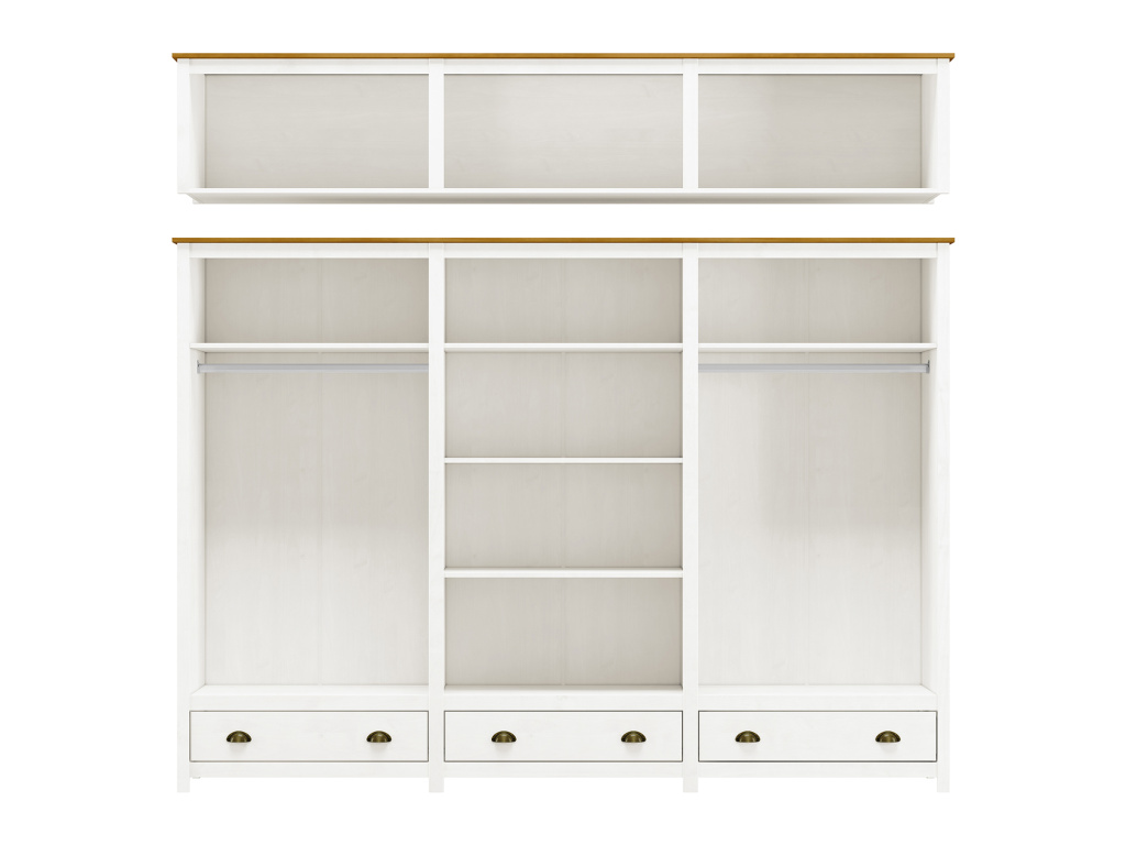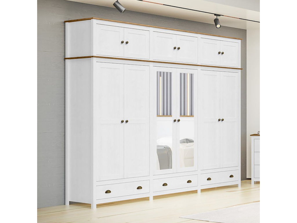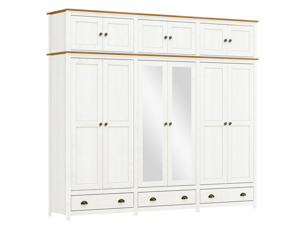 Skříň TOPAZIO s 12 dveřmi je elegantní a prostorné řešení pro vaši ložnici, vyrobené z kvalitního masivu borovice v kombinaci bílé barvy a hnědého laku. Nabízí tři praktické zásuvky s kovovými úchytkami a pojezdy pro snadné a tiché otevírání. V levé a pravé části skříně se nachází police a kovová šatní tyč pro pohodlné zavěšení oblečení, střední část je vybavena třemi policemi pro přehledné uložení složeného prádla. Dvě střední dveře jsou osazeny zrcadly, která opticky zvětšují prostor a dodávají skříni praktický i stylový prvek. Součástí dodávky je i nástavec, který rozšiřuje úložný prostor a zvyšuje celkovou funkčnost skříně.