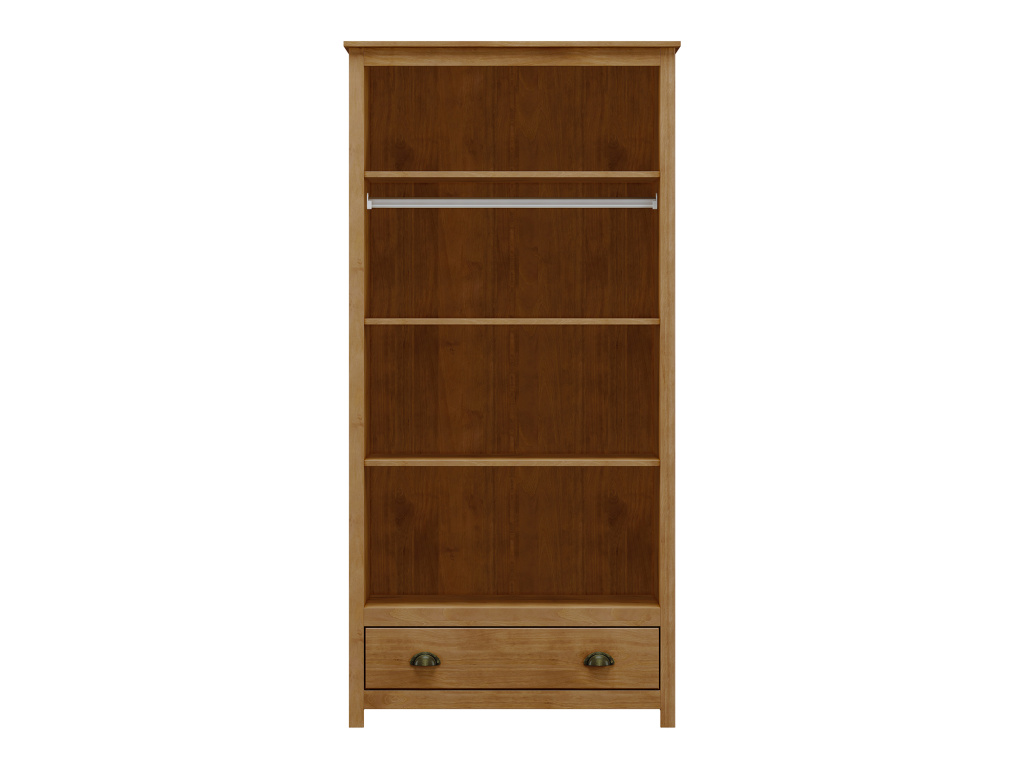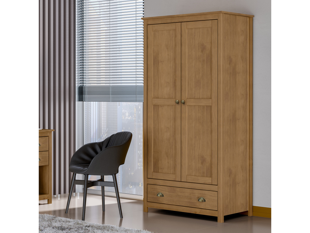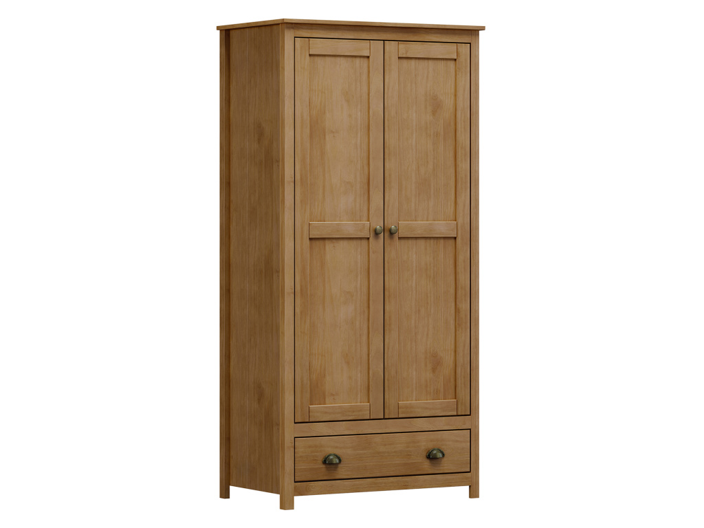 Dvoukřídlá skříň TOPAZIO v atraktivním dubovém provedení je vyrobena z masivní borovice, která zajišťuje pevnost, stabilitu a dlouhou životnost. Uvnitř najdete praktickou polici a kovovou šatní tyč pro přehledné uložení oblečení, dole pak prostornou zásuvku s kovovými pojezdy a elegantními kovovými úchytkami. Tento kvalitní a nadčasový kus nábytku skvěle doplní vaši ložnici, předsíň nebo šatnu.