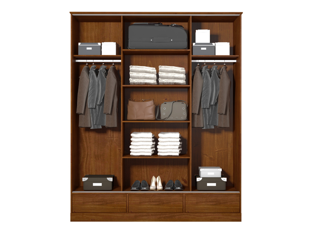 Tato skříň je vybavena 3 zásuvkami, které mají kovové pojezdy, což zajišťuje plynulý a tichý chod při otevírání a zavírání. Vnitřní uspořádání skříně je prakticky promyšleno s ohledem na maximální úložný prostor. Střední část skříně obsahuje 3 posuvné dveře, které skrývají 4 police, ideální pro uspořádání oblečení, obuvi nebo jiných položek.