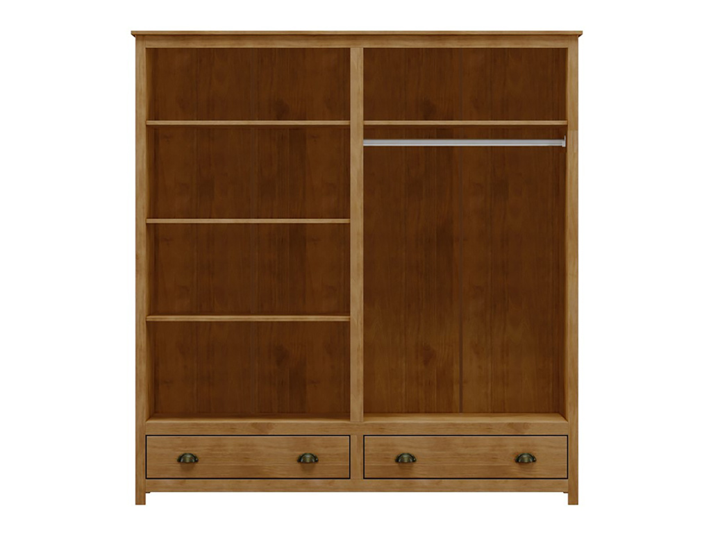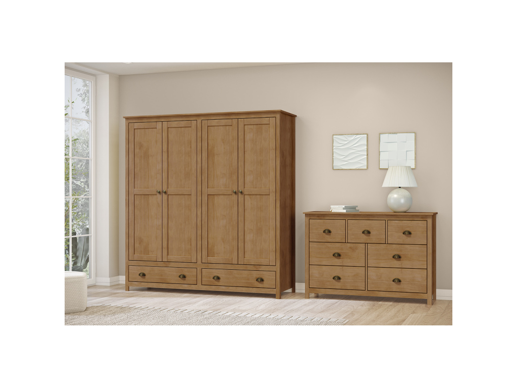 Čtyřdveřová skříň TOPAZIO v přírodním dubovém provedení je vyrobena z masivní borovice, která zaručuje vysokou pevnost, stabilitu a dlouhou životnost. Praktické vnitřní členění nabízí v levé části tři prostorné police, v pravé části jednu polici a kovovou šatní tyč pro pohodlné zavěšení oblečení. Dvě spodní zásuvky s kovovými pojezdy a elegantními kovovými úchytkami poskytují další úložný prostor pro prádlo či doplňky. Stylový a funkční nábytek, který skvěle doplní vaši ložnici nebo šatnu.