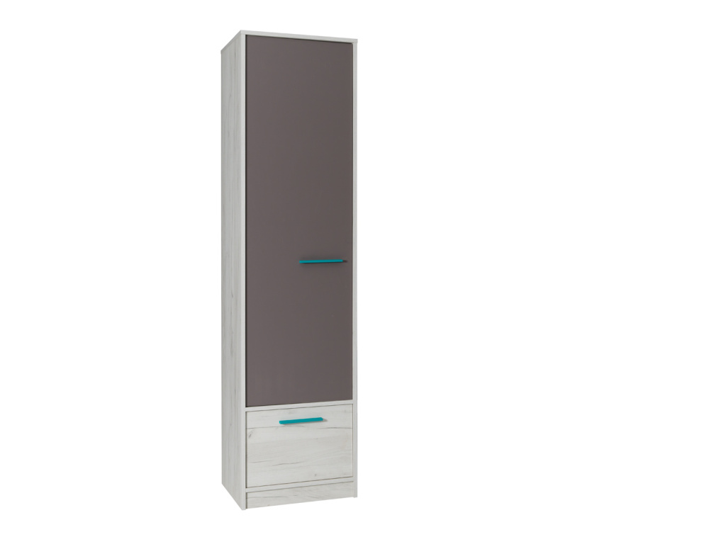 Skříň REST 09 vyniká svou barevnou kombinací světlého dřeva a šedé barvy, která vytváří jemný a příjemný kontrast. Toto ladění je ideální pro tmavší prostory, které dokáže účinně rozjasnit a oživit. Tento nábytek je také doplněn o barevně laděné úchytky v barvách žluté, šedé, tyrkysové a růžové, které dodávají celému kusu jedinečný vzhled.