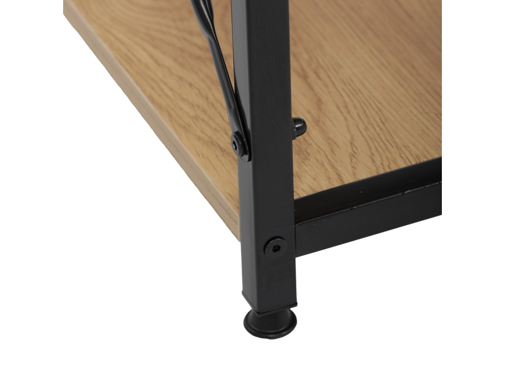 Deska stolu je vyrobena z kvalitního MDF materiálu s dekorativním povrchem v odstínu dubu, který věrně imituje dřevo a zároveň zaručuje odolnost a snadnou údržbu. Stabilní černá kovová konstrukce stolu zajišťuje pevnost a dlouhou životnost. Součástí stolu je praktický regál pro ukládání dokumentů, knih, kancelářských potřeb nebo dekorací, což vám umožní mít vše potřebné vždy po ruce a zároveň udržovat pracovní prostor přehledný.
