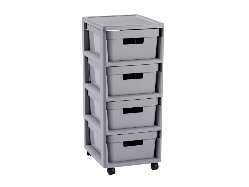 Ideální uspořádání bytových doplňků. Jednoduchý design se 4 velkými zásuvkami - objem 1L. Skříňka se snadno udržuje čistá - vyrobeno z hladkého plastu. Snadná manipulace díky kolečkům. Vhodné do šatny, koupelny, dětského pokoje i garáže. Barva - šedá konstrukce , šedé šuplíky.Doplňkové parametry
