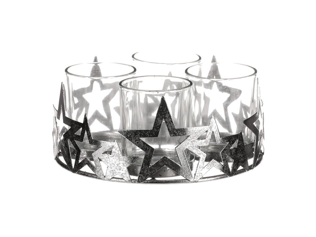 Tento kovový svícen ve stříbrné barvě je dobrým základem pro tvorbu vlastní kreativní vánoční a zejména adventní výzdoby. Obsahuje celkem čtyři držáky se skleněnými kalíšky pro vložení svíček a zbytek tvoří ozdobná konstrukce s hvězdičkami. Svojí univerzálností a všestranností nabízí nepřeberné množství využití a je jen na vaší fantazii a dekoračních schopnostech, jak jej případně dozdobit a kam jej nejlépe umístit.Doplňkové parametry