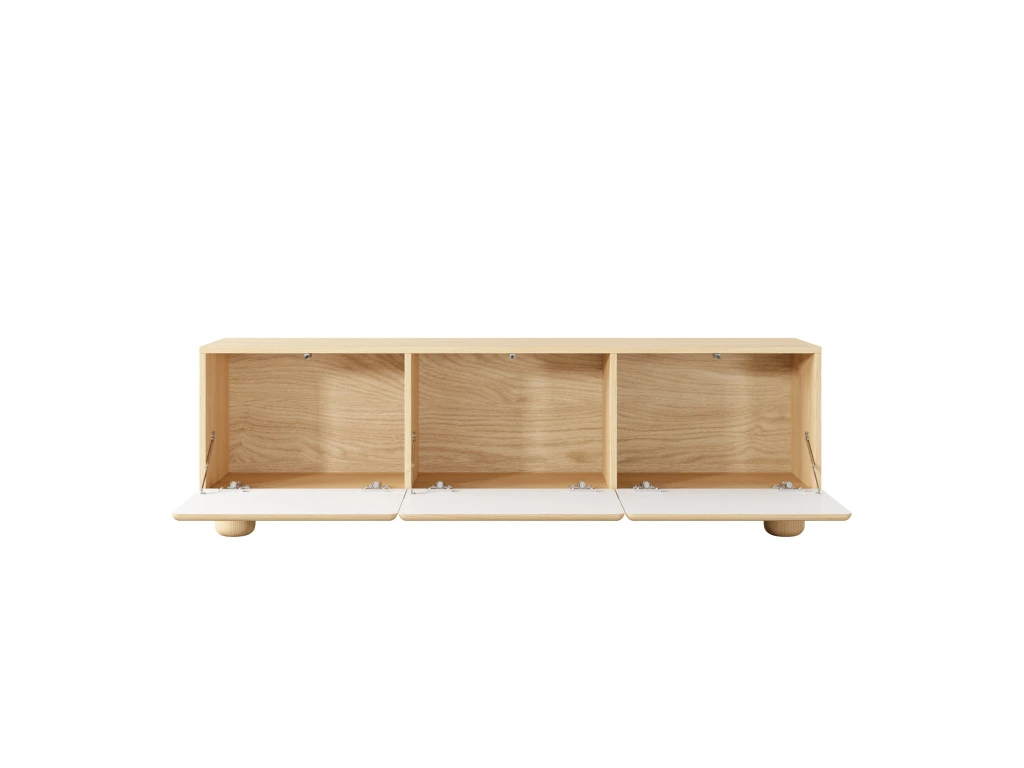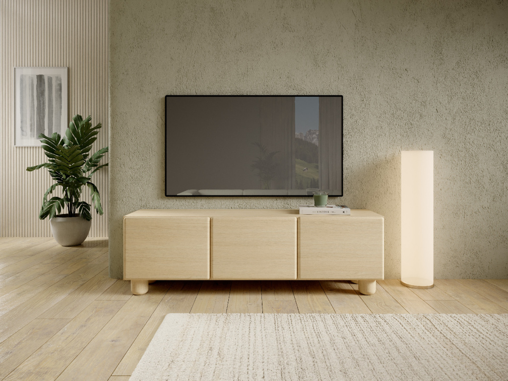 Televizní stolek Lomo 3D nabízí praktický úložný prostor za třemi dvířky a zaujme čistým, harmonickým designem. Kolekce Lomo v sobě spojuje minimalistické tvary s jemně zaoblenými liniemi a teplým dekorem světlého dřeva dub Vicenza. Výrazným prvkem jsou zaoblené hrany a masivní válcovité nohy, které dodávají nábytku osobitý, téměř sochařský charakter. Díky absenci úchytek a systému push-to-open vyniká čistý design a celek působí klidně, harmonicky a přirozeně v každém interiéru.