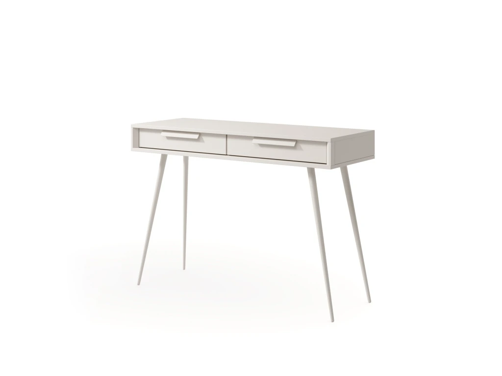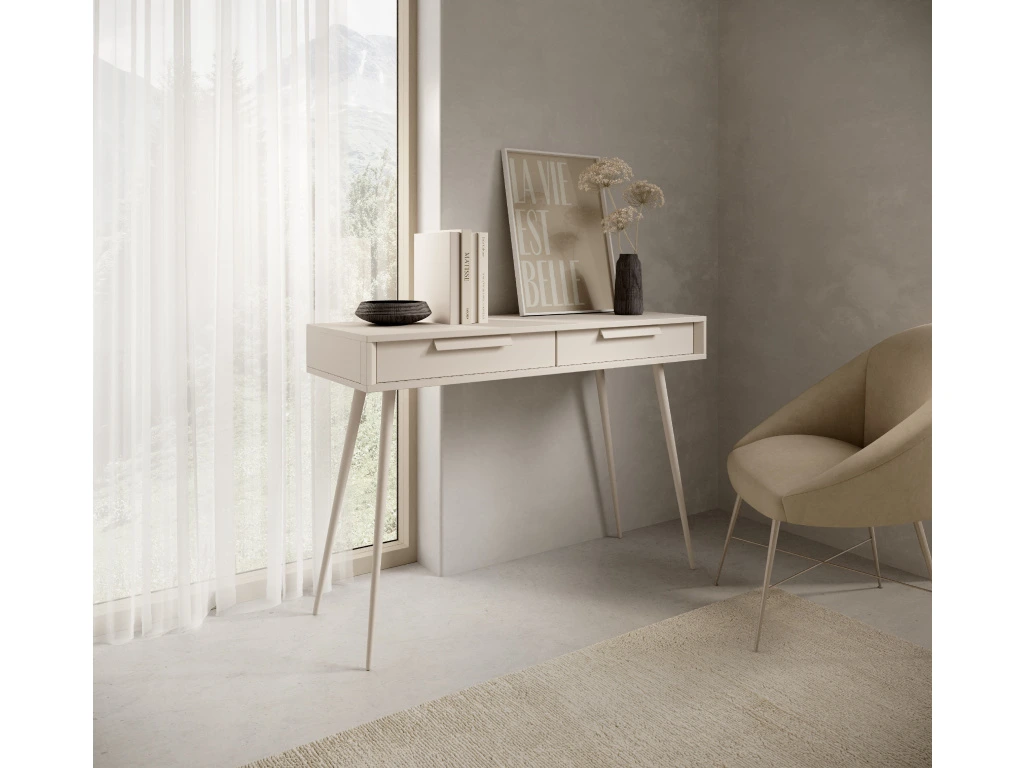 Toaletní stolek Mavera nabízí dvě praktické zásuvky pro uložení drobností a zaujme čistým, elegantním designem. Sektorový nábytek Mavera zaujme klidnou, harmonickou estetikou doplněnou o moderní a lehce originální prvky. Jemný odstín kašmíru v kombinaci s minimalistickými tvary a štíhlými, vysokými nožkami působí elegantně a vzdušně. Charakteristickým detailem jsou podlouhlé úchytky a lehce předsazené hrany korpusu, které dodávají nábytku osobitý a současný vzhled.