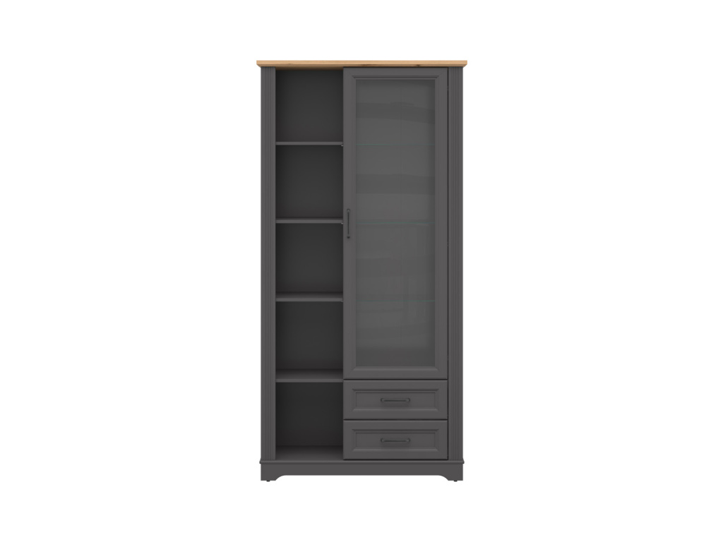 Vitrína nabízí kombinaci polic za prosklenými dvířky, praktických zásuvek a otevřeného policového prostoru, takže každý předmět má své místo. Nadčasové barevné propojení grafitu a dubu artisan působí moderně a zároveň útulně – grafit dodává nábytku hloubku a eleganci, zatímco dub artisan vnáší do prostoru přirozené teplo. Jemně frézované detaily podtrhují sofistikovaný vzhled vitríny, která se skvěle hodí do obývacího pokoje, ložnice i pracovny.
