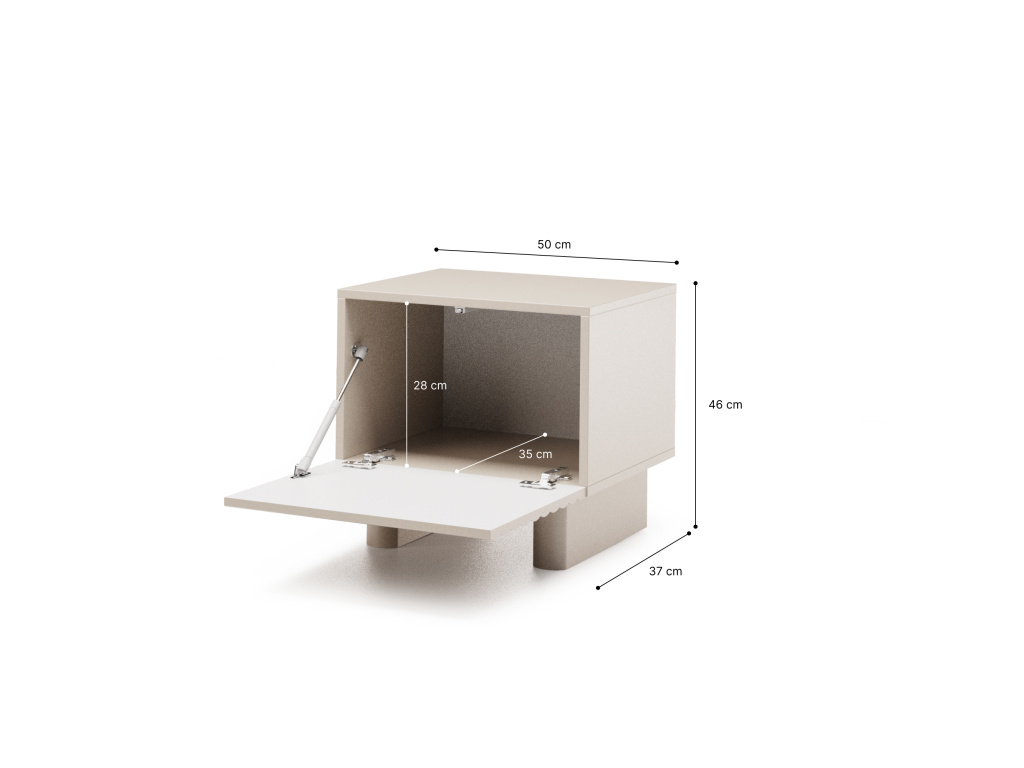 Noční stolek Toyo v elegantní barvě Kašmír je stylovým a praktickým doplňkem moderní ložnice, který zaujme svým čistým designem a nadčasovou elegancí. Kvalitní dvířka z MDF o tloušťce 18 mm působí pevně a luxusně, zatímco korpus o síle 15 mm s odolnou ABS hranou 0,5 mm zajišťuje dlouhou životnost a ochranu proti poškození. Bezúchytkový systém otevírání PUSH OPEN umožňuje pohodlné a tiché ovládání a podtrhuje minimalistický charakter nábytku. Noční stolek nabízí praktický úložný prostor pro vše, co chcete mít po ruce, a díky rozměrům 46 × 50 × 37 cm se skvěle hodí i do menších ložnic, kde vytvoří harmonický a funkční celek v moderním stylu.