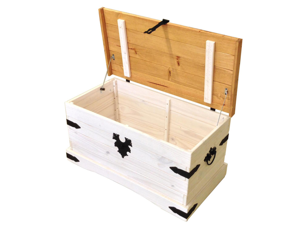 Truhla CORONA bílý vosk 16451B je elegantním a praktickým doplňkem pro váš interiér. Tato truhla je vyrobena z masivu borovice voskovaného v bílém odstínu, což jí dodává moderní a čistý vzhled. Horní deska truhly je také z masivu borovice, ale v medovém odstínu, což vytváří krásný kontrast.