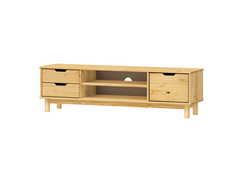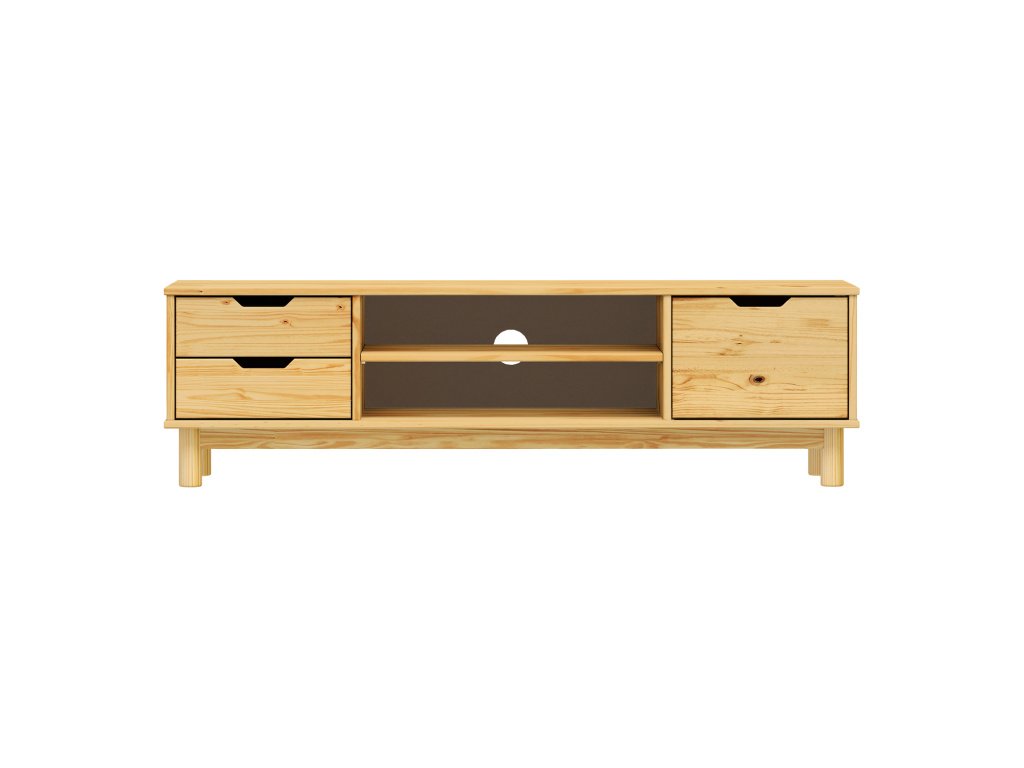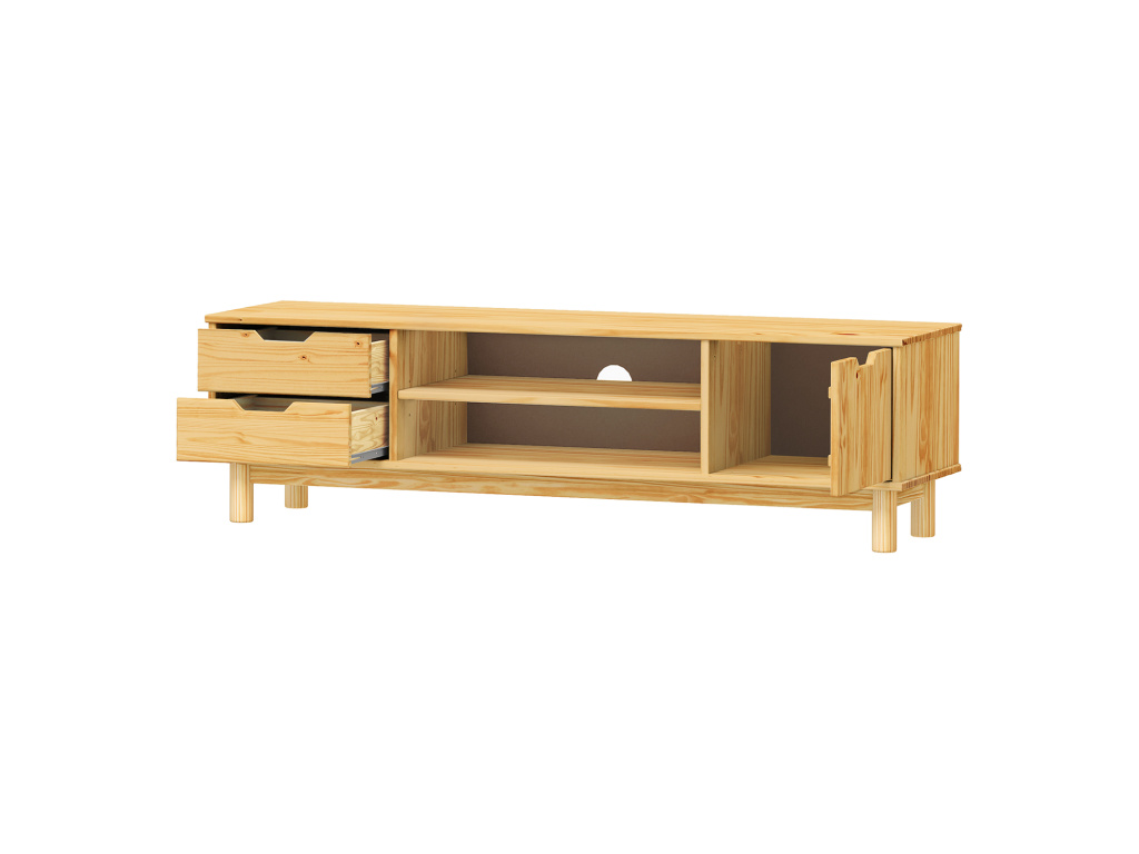 TV stolek BONITO 2 s 1 dvířky a 2 zásuvkami v lakovaném provedení nabízí dokonalou kombinaci stylu a praktického uspořádání pro váš obývací pokoj. Je vyroben z masivní borovice, která zajišťuje pevnost, stabilitu a dlouhou životnost, a lakovaný povrch chrání dřevo a usnadňuje jeho údržbu. Dvě prostorné zásuvky s kovovými pojezdy umožňují plynulé a tiché otevírání a poskytují úložný prostor pro drobnosti, zatímco dvířka a otevřená police s otvorem pro vedení kabelů nabízejí ideální řešení pro multimediální zařízení. Nadčasový design TV stolku BONITO 2 se snadno kombinuje s ostatním nábytkem a stane se elegantním a funkčním doplňkem vašeho interiéru.
