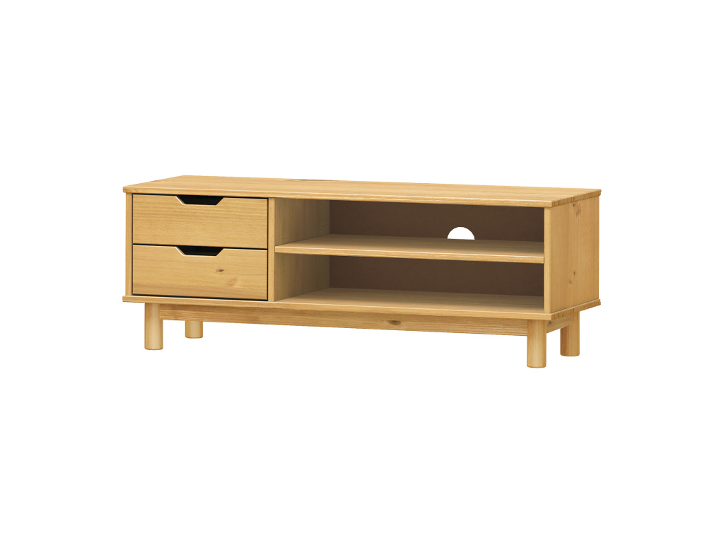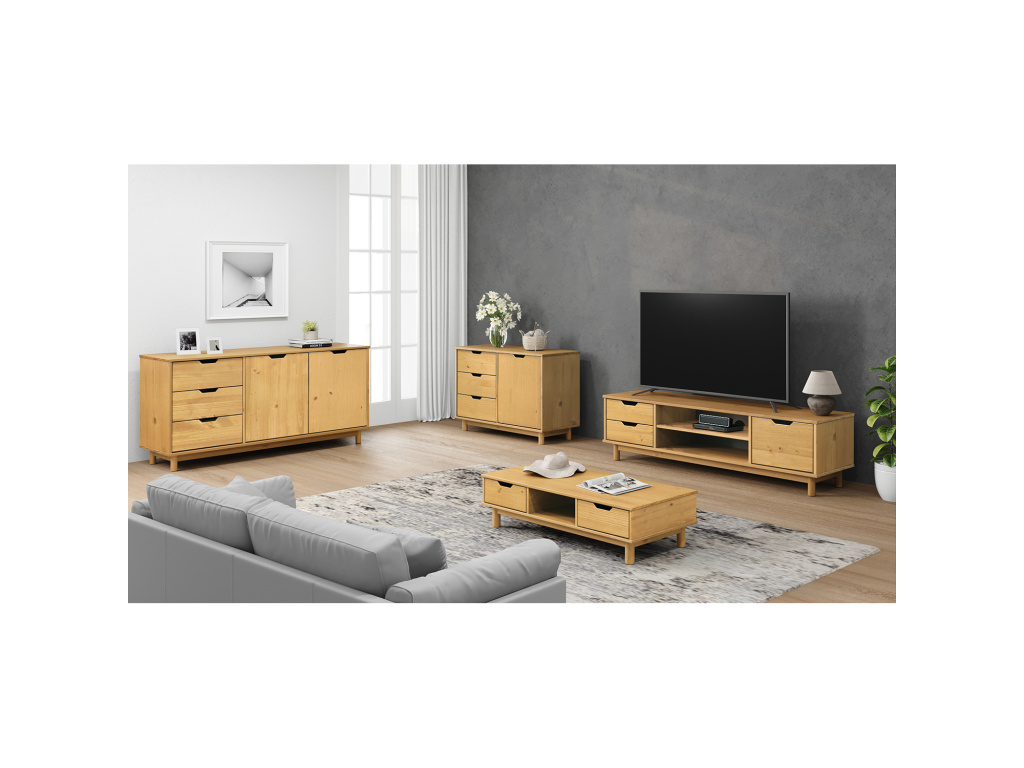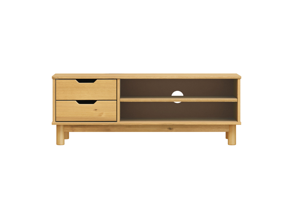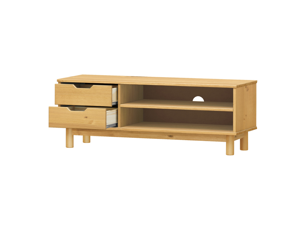 TV stolek BONITO 2 se dvěma zásuvkami ve voskovaném provedení v medovém odstínu přináší do vašeho obývacího pokoje přírodní teplo a elegantní vzhled masivního dřeva. Je vyroben z kvalitní masivní borovice, jejíž kresba je zvýrazněna ochrannou voskovou úpravou, která chrání povrch a podtrhuje autentický charakter nábytku. Dvě prostorné zásuvky s kovovými pojezdy zajišťují plynulé a tiché otevírání a poskytují ideální úložný prostor pro drobnosti a příslušenství, zatímco otevřená police s otvorem pro vedení kabelů umožňuje praktické a přehledné uspořádání multimediálních zařízení. Nadčasový design stolku BONITO 2 se snadno kombinuje s ostatním nábytkem a stane se stylovým a funkčním doplňkem vašeho interiéru.
