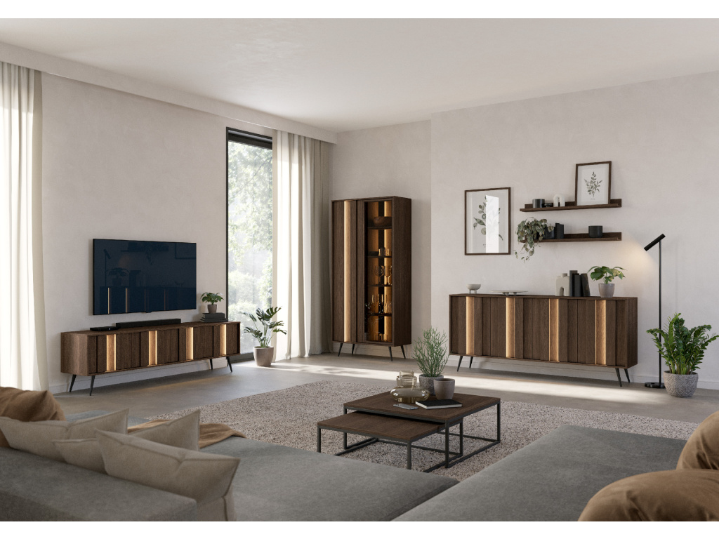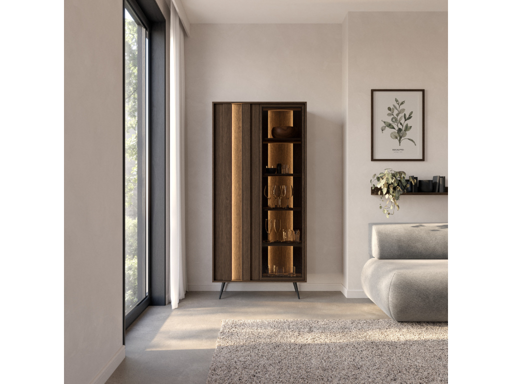 Vitrína Amaro 2D kombinuje prosklenou část s jemným LED osvětlením, které nechá vyniknout uložené dekorace i detaily nábytku. Elegantní tmavý dekor dubu Dunin a vertikální lamely na čelech dodávají kusu výrazný, moderní charakter. Univerzální provedení umožňuje zvolit levé nebo pravé otevírání při montáži. Kolekce Amaro zaujme na první pohled svou tmavou dřevodekorovou kresbou v odstínu dubu Dunin, doplněnou o dekorativní lamely a subtilní LED podsvícení. Jednoduché tvary bez úchytek, štíhlé kovové nohy a kombinace plných i prosklených prvků vytváří elegantní, vzdušný celek v moderním stylu.