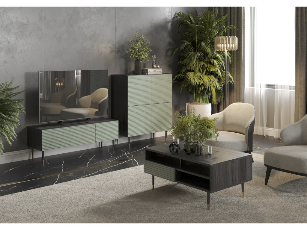 Luxusní a stylová vitrína IMPERIAL v elegantním pistáciově zeleném provedení vnese do vašeho interiéru svěžest a originalitu. Žebrované přední díly zdůrazňují moderní design, díky kterému je vitrína nejen praktickým úložným prostorem, ale také výrazným designovým prvkem. Pistáciová zelená barva dodává nábytku jedinečnost a neotřelý vzhled. Díky systému PUSH TO OPEN je otevírání snadné a minimalistické bez potřeby klasických rukojetí. Vyšší kovové nohy v černo-zlaté kombinaci dodávají vitríně sofistikovaný styl a zároveň zajišťují snadnější údržbu podlahy. Vitrína IMPERIAL je ideální volbou pro ty, kteří hledají spojení funkčnosti a moderního designu.