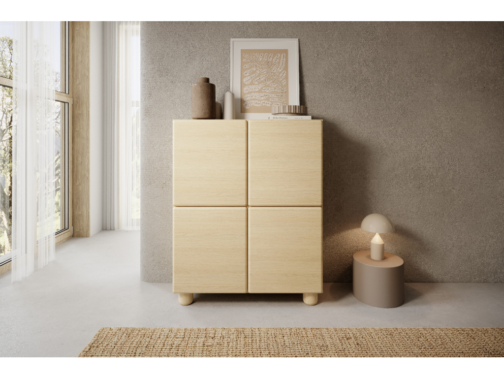 Vysoká komoda Lomo 4D nabízí praktický úložný prostor ukrytý za čtyřmi dvířky a zaujme čistým, harmonickým designem. Kolekce Lomo v sobě spojuje minimalistické tvary s jemně zaoblenými liniemi a teplým dekorem světlého dřeva dub Vicenza. Výrazným prvkem jsou zaoblené hrany a masivní válcovité nohy, které dodávají nábytku osobitý, téměř sochařský charakter. Díky absenci úchytek a systému push-to-open vyniká čistý design a celek působí klidně, harmonicky a přirozeně v každém interiéru.