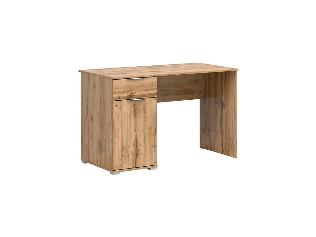 Jednoduchý, ale praktický je psací stůl ZELE, který se hodí do menších pokojů či kanceláří. Poskytuje dostatečný prostor pro PC, klávesnici a vše co potřebujete k práci s počítačem. V noze stolu se nachází zásuvka vhodná pro umístění drobností a za dvířky police. Konstrukce je vyrobena z lamina v barevném provedení dub wotan. Tento materiál se snadno udržuje a tak vám nábytek vydrží dlouhou dobu.