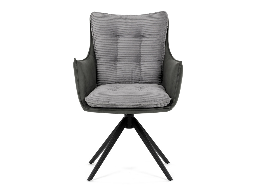 Jídelní židle DCH-D1345 GREY2 značky Autronic vyniká otočným 360° vratným mechanismem, který zajišťuje plynulý a tichý návrat do výchozí polohy, což přispívá k pohodlí a praktičnosti při používání. Konstrukce židle kombinuje pevný černý kovový rám s moderním designem čtyřnohé podnože, která zaručuje stabilitu a dlouhou životnost. Sedák a opěradlo jsou potaženy kombinací dvou typů šedé látky, přičemž vnitřní část tvoří měkký, žebrovaný textil s vysokým polstrováním, které poskytuje ergonomickou podporu a komfort i při delším sezení. Čalounění je pečlivě prošité a tvarované tak, aby zvýraznilo estetiku a zároveň zajistilo dostatečnou prodyšnost materiálu. Područky jsou integrovány do celkové konstrukce sedáku, což zvyšuje komfort bez omezení pohybu. Díky kombinaci kvalitních materiálů a funkčních prvků je židle vhodná pro moderní jídelny i pracovní prostory, kde je kladen důraz na design i uživatelský komfort.Doplňkové parametry